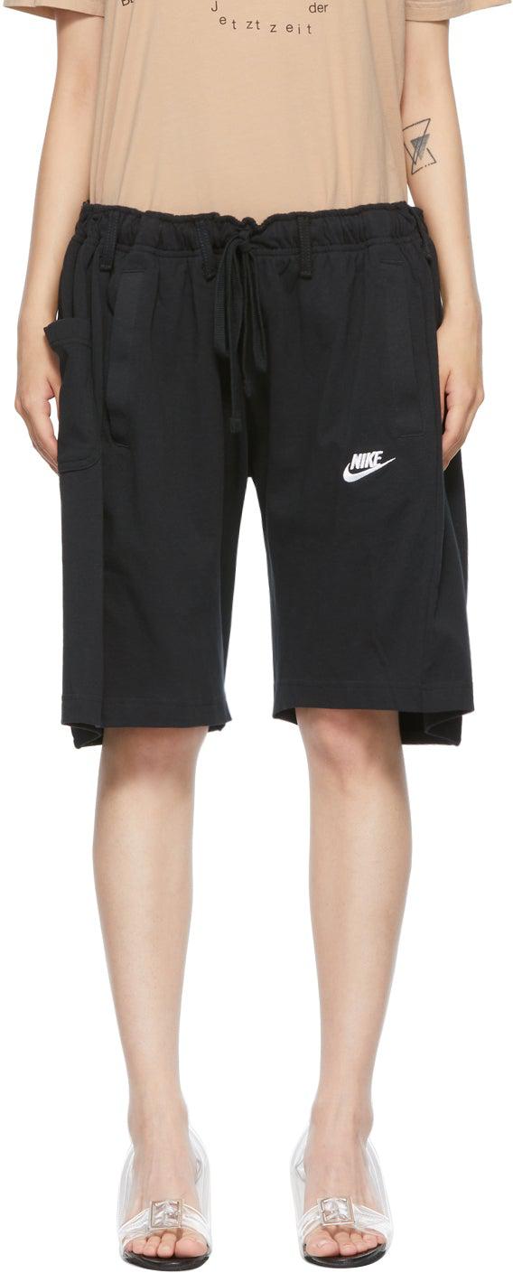 Upcycled cotton jersey and non-stretch denim shorts in black. Mid-rise. Paneled construction. Five-pocket styling. Belt loops and drawstring at partially elasticized waistband. Logo embroidered in white at front leg. Leather logo patch in tan and logo-engraved hardware at back waistband. Textile logo flag in red at back pocket. Silver-tone hardware. Each item is unique. Please note that coloration may vary. Part of the Nº69 Lost In Contemplation collection. Supplier color: Black 100% cotton. Brand: Bless