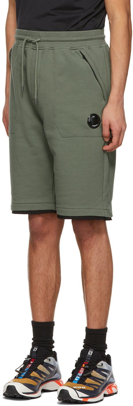 Garment-dyed fleece shorts in green. Mid-rise. Three-pocket styling. Drawstring at waistband. Logo hardware in black at front leg. Taffeta trim in black featuring bungee-style fastening at cuffs. Mock fly. Black and gunmetal-tone hardware. Supplier color: Laurel wheat 100% cotton. Brand: C.P. Company