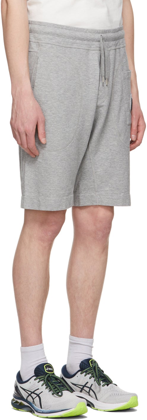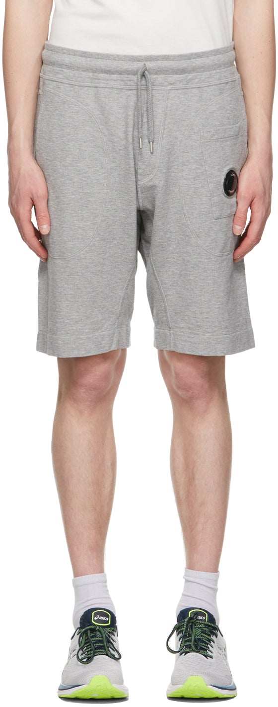 Garment-dyed French terry shorts in grey. Mid-rise. Two-pocket styling. Drawstring at waistband. Patch pocket and logo hardware at front leg. Black and silver-tone hardware. Supplier color: Grey mélange 100% cotton. Brand: C.P. Company
