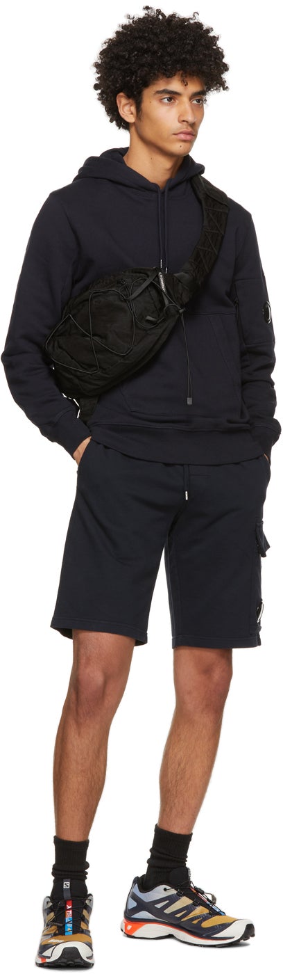 Garment-dyed fleece shorts in navy. Mid-rise. Two pocket styling. Drawstring at waistband. Flap pocket featuring logo hardware at outseam. Mock fly. Black and silver-tone hardware. Supplier color: Total eclipse 100% cotton. Brand: C.P. Company