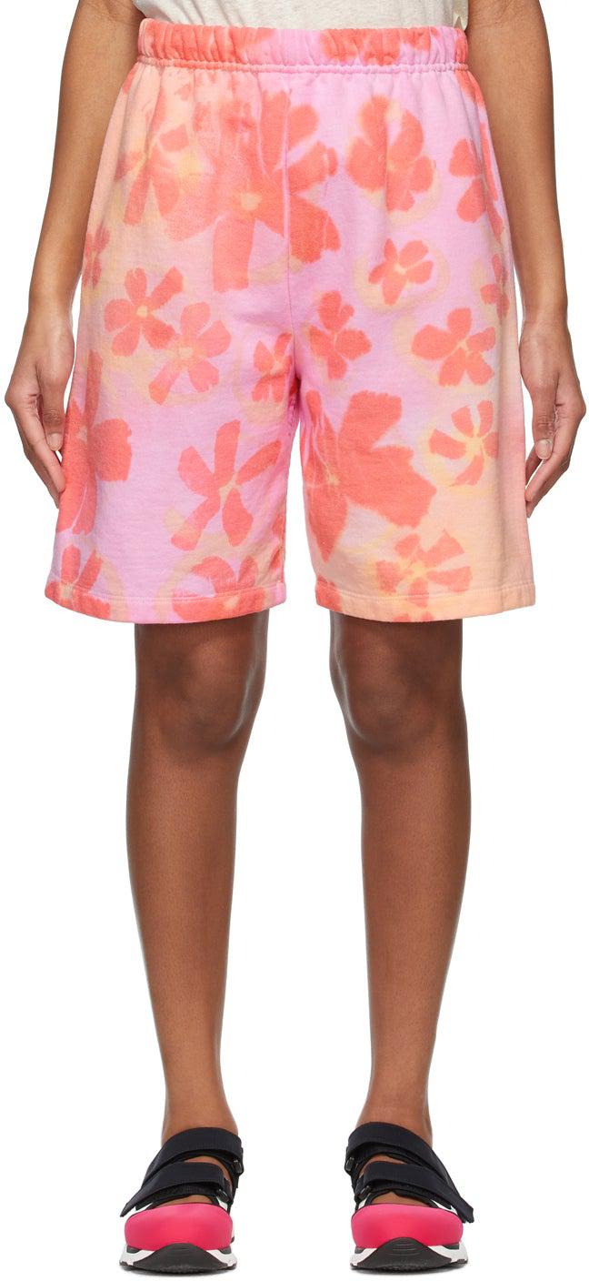Cotton-blend fleece shorts in pink featuring floral pattern in tones of pink and yellow. Mid-rise. Concealed drawstring at elasticized waistband. Available exclusively at SSENSE. Supplier color: Flower patch 50% cotton, 50% polyester. Brand: Collina Strada