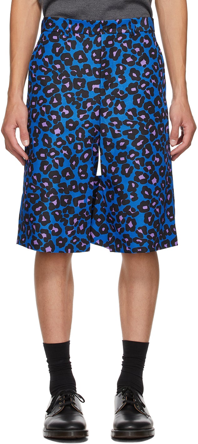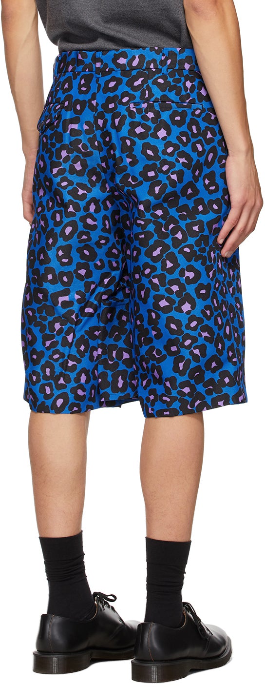 Wide-leg nylon canvas shorts in blue featuring leopard pattern in purple and black throughout. Mid-rise. Integrated panel at dropped inseam. Four-pocket styling. Belt loops at waistband. Zip fly. Cupro lining. Partially lined. Silver-tone hardware. Supplier color: Blue Body: 100% nylon. Lining: 100% cupro. Brand: Comme des Garçons Homme Plus