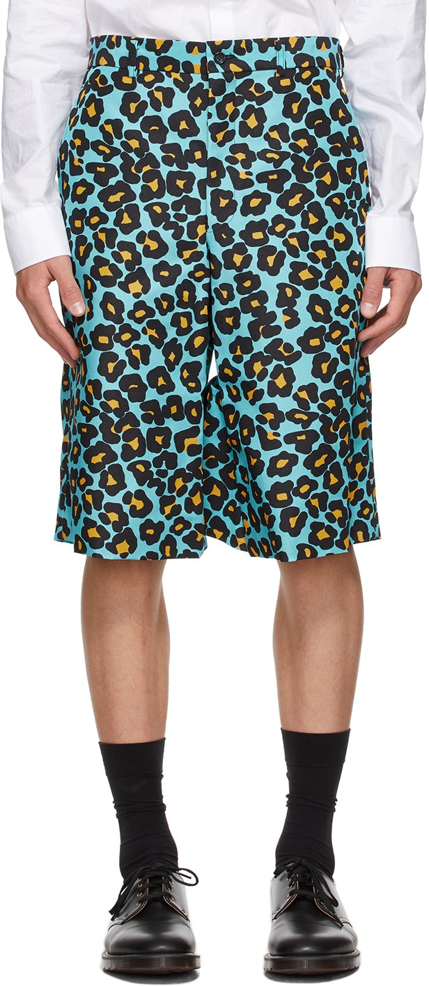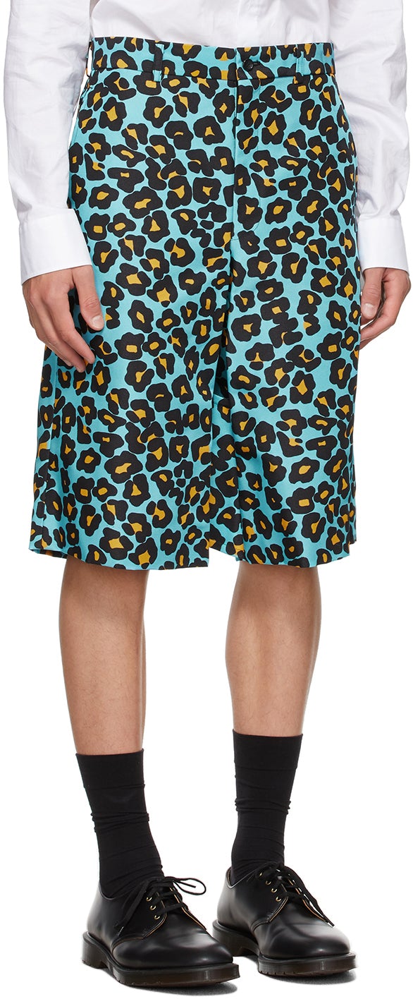 Wide-leg nylon canvas shorts in blue featuring leopard pattern in yellow and black throughout. Mid-rise. Integrated panel at dropped inseam. Four-pocket styling. Belt loops at waistband. Zip fly. Partially lined. Silver-tone hardware. Supplier color: Green Body: 100% nylon. Lining: 100% cupro. Brand: Comme des Garçons Homme Plus