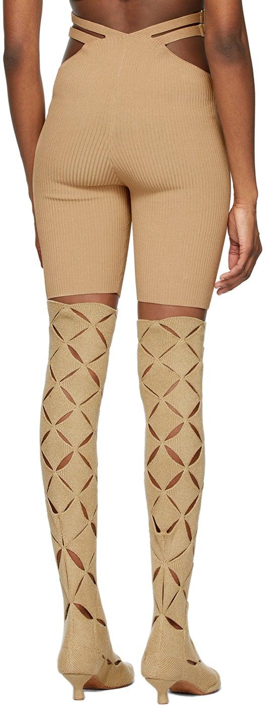 Stretch rib knit nylon-blend shorts in beige. High-rise. Cut-outs and straps with hook-eye fastening at waistband. Gold-tone hardware. Supplier color: Timber/Blonde 72% viscose, 27% nylon, 1% elastane. Brand: Dion Lee