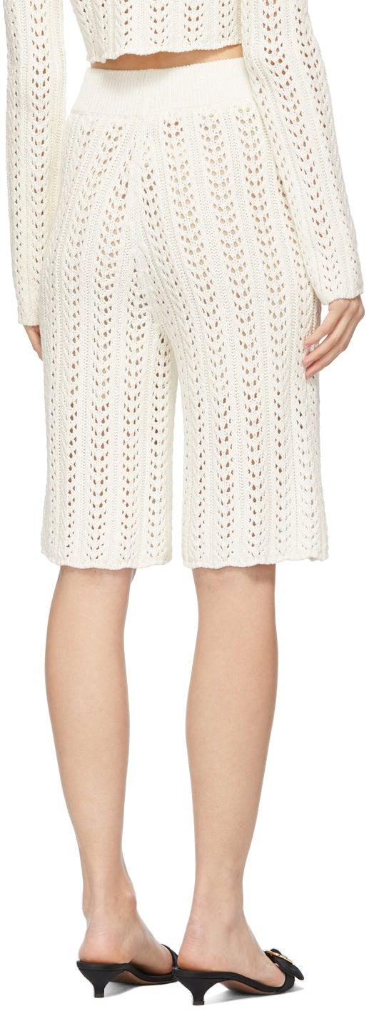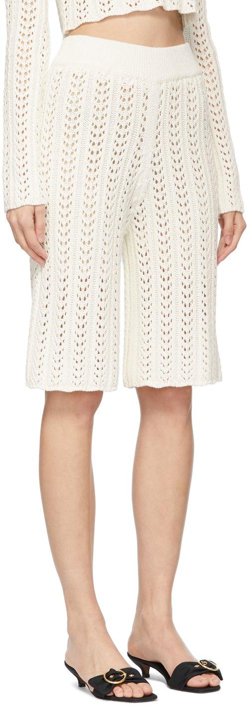 Open knit cotton and linen-blend shorts in off-white. High-rise. Rib knit elasticized waistband. Tonal mesh lining. Supplier color: Ivory Body: 48% rayon, 45% cotton, 7% linen. Lining: 92% nylon, 8% polyurethane. Brand: DRAE