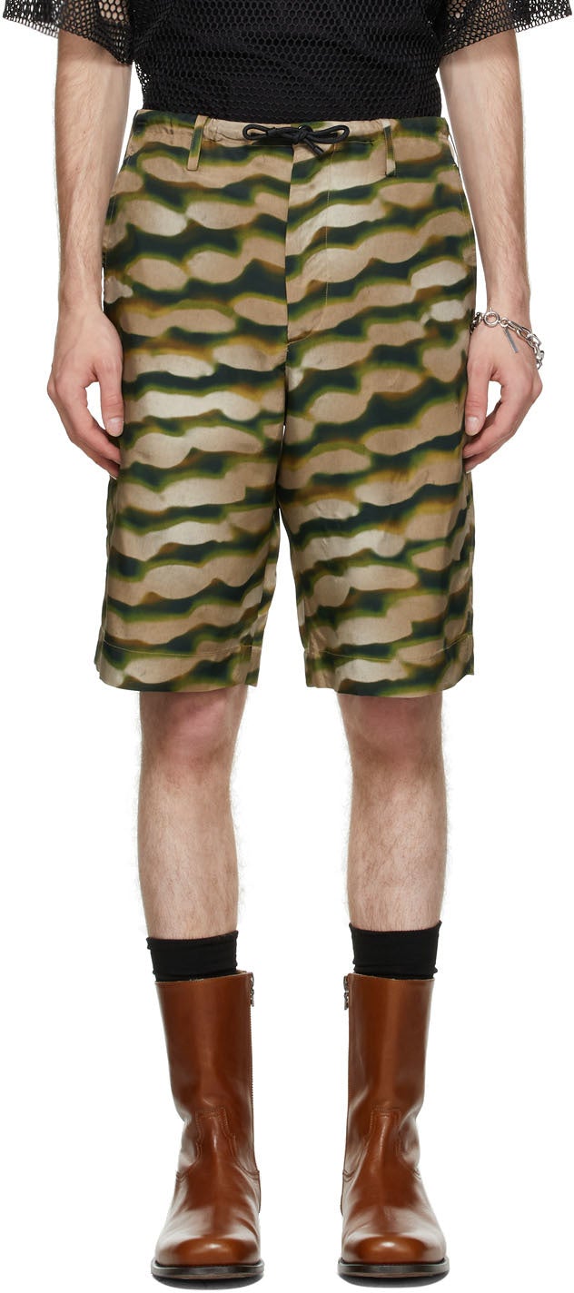 Viscose twill shorts featuring graphic pattern in green and khaki throughout. Mid-rise. Three-pocket styling. Drawstring in black and belt loops at waistband. Zip-fly. Part of the Dries Van Noten x Len Lye collaboration. Supplier color: Khaki Body: 100% viscose. Lining: 100% cotton. Brand: Dries Van Noten
