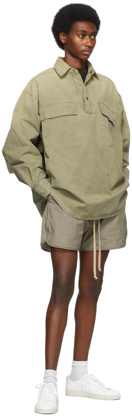 Crinkled nylon taffeta shorts in khaki. Mid-rise. Four-pocket styling. Drawstring in beige at elasticized waistband. Leather logo patch in black at front. Full perforated faux-suede lining in beige. Supplier color: Taupe Body: 100% nylon. Lining: 65% polyester, 35% polyurethane. Brand: Fear of God