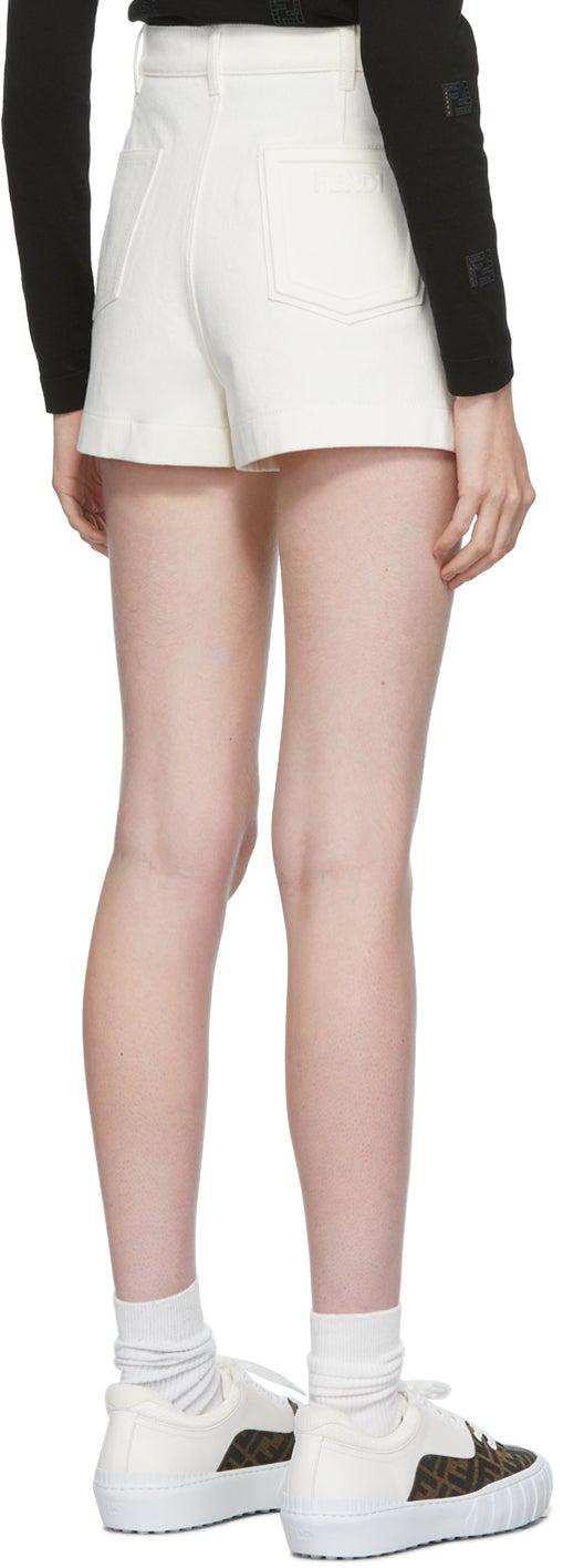 Non-stretch denim shorts in off-white. Mid-rise. Five-pocket styling. Belt loops and pleats at waistband. Embossed logo at back pocket. Zip-fly. Supplier color: White 100% cotton. Brand: Fendi