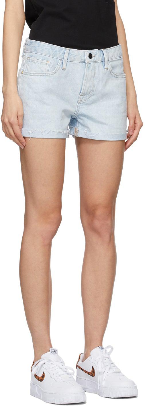 Non-stretch denim shorts in blue. High-rise. Fading and distressing throughout. Five-pocket styling. Belt loops at waistband. Rolled cuffs. Zip-fly. Logo-engraved gunmetal-tone and gold-tone hardware. Contrast stitching in tan. Supplier color: Howard 85% cotton, 15% recycled cotton. Brand: Frame