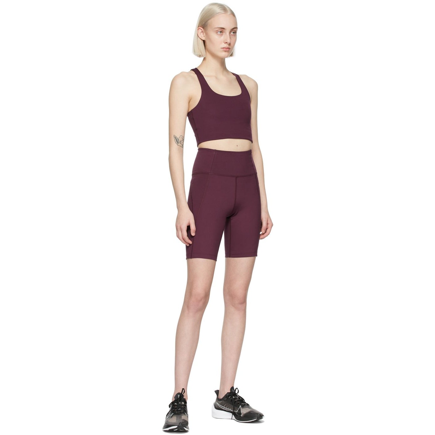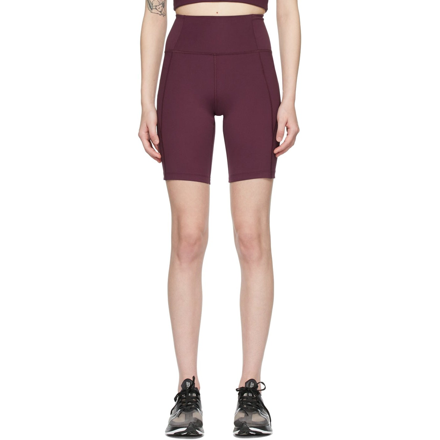 Stretch recycled jersey shorts in purple. High-rise. Tonal overlock stitching throughout. Elasticized waistband. Concealed welt pocket at back waistband. Supplier color: Plum 79% recycled polyester, 21% spandex. Brand: Girlfriend Collective