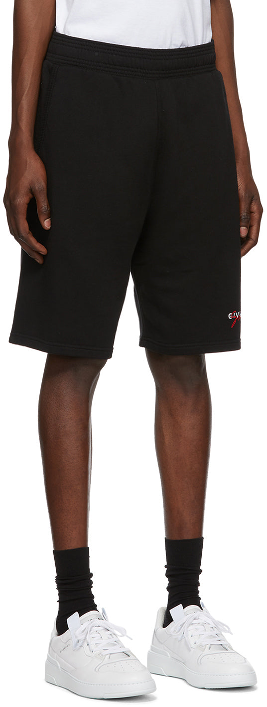 French terry short in black. Mid-rise. Two-pocket styling. Concealed drawstring at elasticized waistband. Logo printed and embroidered in white and red at leg. Supplier color: Black/Red 100% cotton. Brand: Givenchy