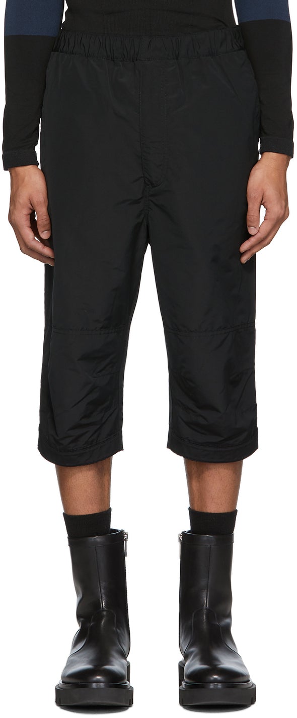 Panelled woven cotton-blend shorts in black. Mid-rise. Four-pocket styling. Concealed drawstring at elasticized waistband. Pleats at knees. Adjustable Velcro tab at cuffs. Tonal bonded logo appliqué at back pocket. Zip-fly. Logo-engraved tonal hardware. Supplier color: Black Body: 63% polyester, 37% cotton. Lining: 100% cotton. Brand: Givenchy