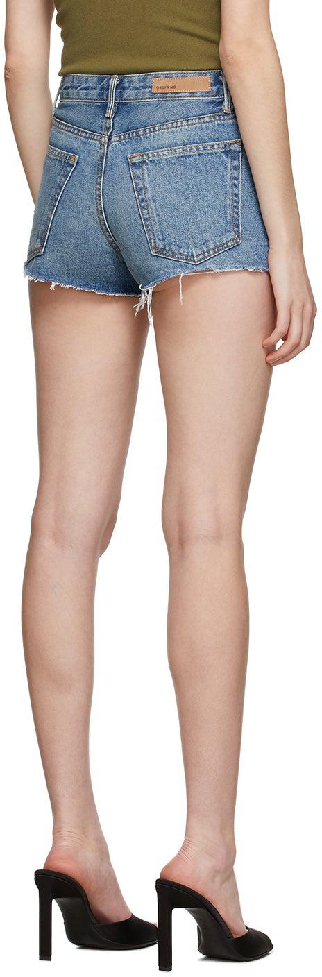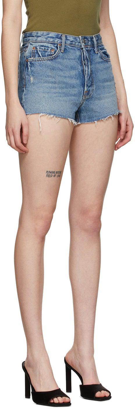 Non-stretch denim shorts in blue. High-rise. Fading, distressing, and whiskering throughout. Five-pocket styling. Leather logo patch in tan at back waistband. Raw edge at cuffs. Button-fly. Antiqued silver-tone and copper-tone hardware. Contrast stitching in tan. Supplier color: Nobody does it better 100% cotton. Brand: Grlfrnd