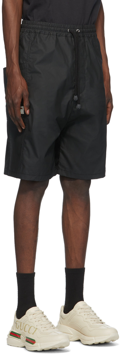 Panelled and coated cotton canvas shorts in black. Mid-rise. Two-pocket styling. Drawstring at elasticized waistband. Patch pockets featuring textile logo flag and web trim in red and green at outseams. Zip-fly. Silver-tone hardware. Supplier color: Black Body: 100% cotton. Trim: 46% acrylic, 46% wool, 8% polyester. Brand: Gucci