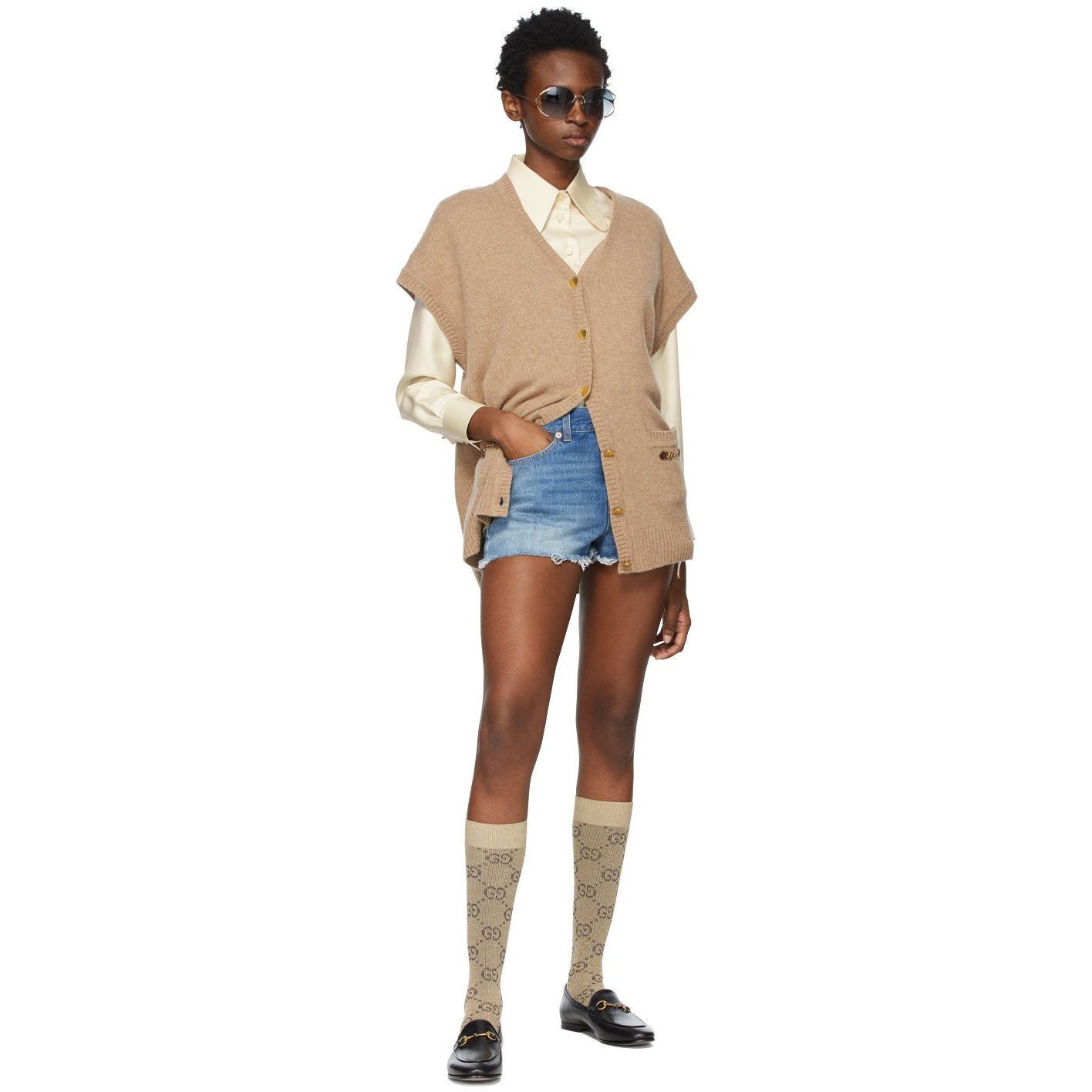 Non-stretch denim shorts in blue. Mid-rise. Fading throughout. Five-pocket styling. Belt loops at waistband. Leather logo patch in black at back waistband. Embroidered graphic in multicolor at back pocket. Distressing at cuffs. Button-fly. Antiqued gold-tone and copper-tone hardware. Contrast stitching in tan. Part of the Gucci x Disney collaboration. Supplier color: Blue Body: 100% cotton. Trim: 100% polyester. Brand: Gucci