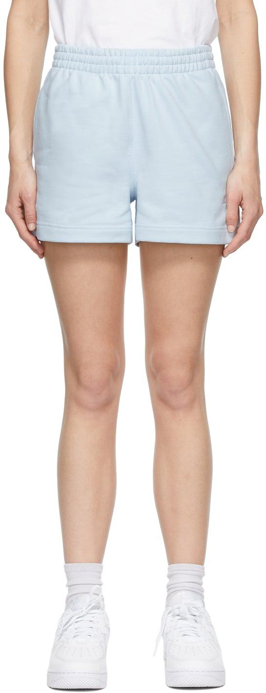 French terry shorts in blue. High-rise. Four-pocket styling. Concealed drawstring at elasticized waistband. Tonal embroidered logo at cuff. Supplier color: Cyber blue 100% cotton. Brand: Helmut Lang