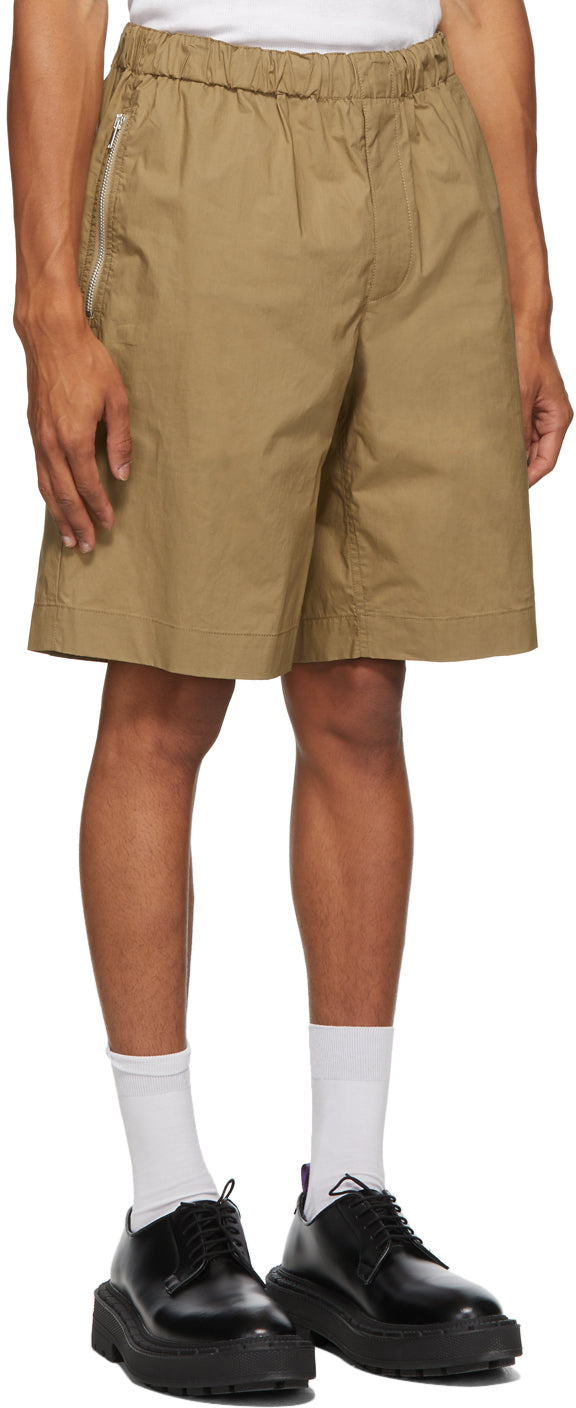 Cotton poplin shorts in tan. Mid-rise. Four-pocket styling. Concealed drawstring at elasticized waistband. Zip-fly. Silver-tone hardware. Supplier color: Trench 100% cotton. Brand: Helmut Lang