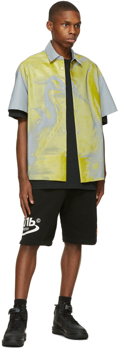 French terry shorts in black. Mid-rise. Three-pocket styling. Concealed drawstring at elasticized waistband. Textile logo patch in orange and logo printed in white at side seams. Textile logo patch in taupe and press-stud fastening at back pocket. Logo-engraved silver-tone hardware. Supplier color: Black/White 100% cotton. Brand: Heron Preston
