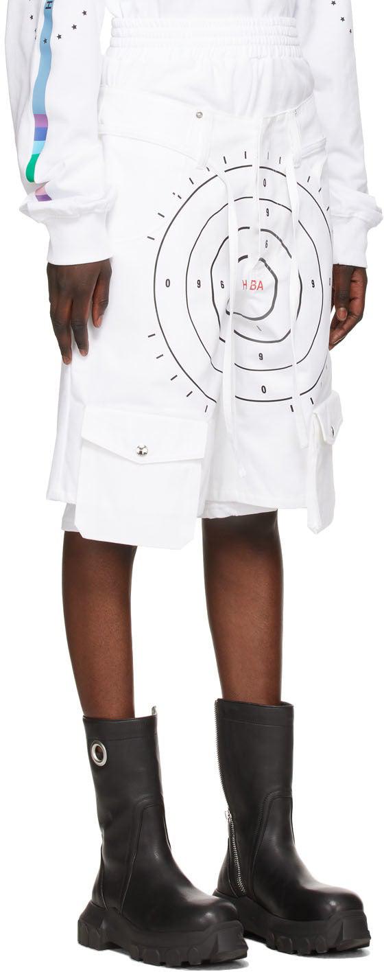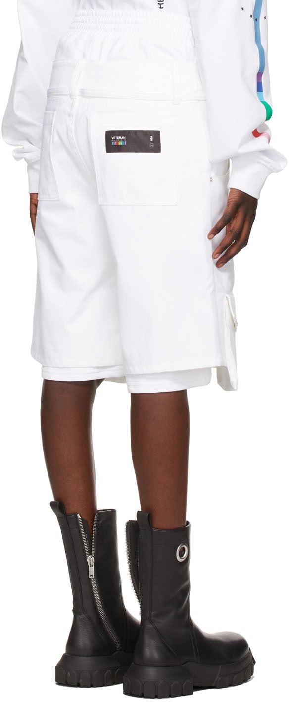 Cotton twill shorts in white. Layered construction. Integrated tonal French terry shorts-style underlay. Mid-rise. Five-pocket styling. Elasticized trim, belt loops, and detachable self-tie belt at waistband. Graphic printed in black and logo printed in red at front. Flap pocket at front legs. Textile logo patch in black at back pocket. Zip-fly. Silver-tone hardware. Part of the Veteran capsule collection. Supplier color: White Body 1: 100% cotton. Body 2: 100% cotton. Brand: Hood by Air