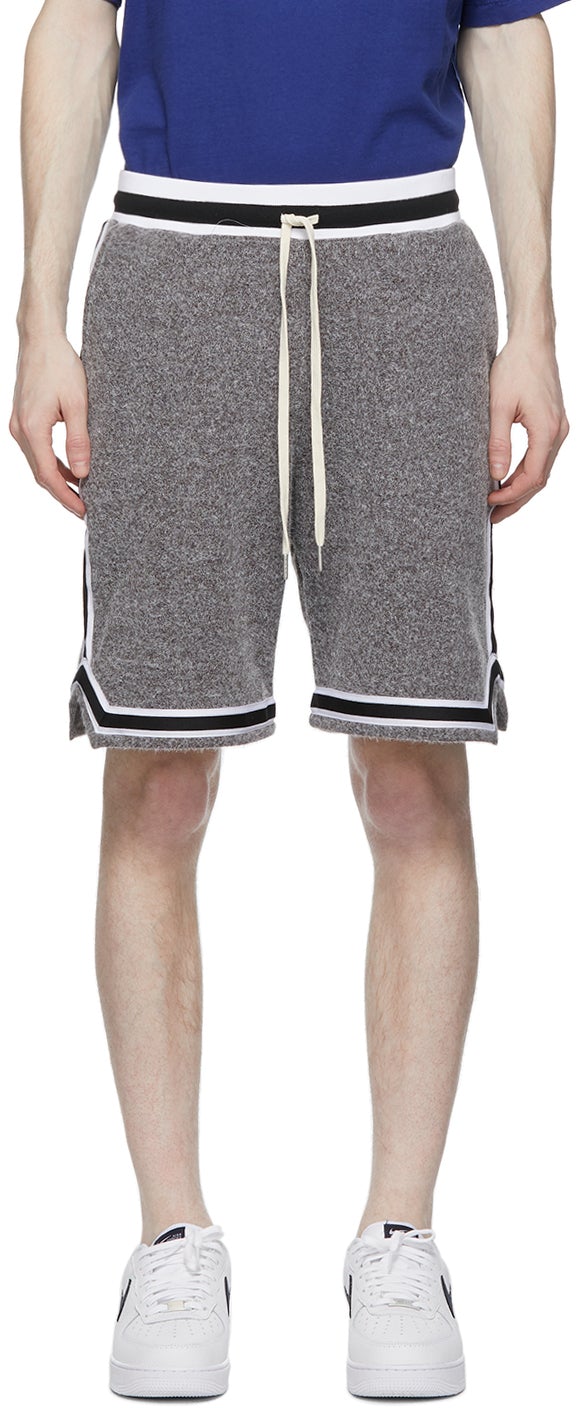 Cotton and nylon-blend French terry shorts in brown. Mid-rise. Textured effect and nylon jersey trim striped in black and white throughout. Two-pocket styling. Drawstring at elasticized waistband. Vented outseams. Supplier color: Satellite Body: 53% cotton, 47% nylon. Trim: 100% nylon. Brand: John Elliott
