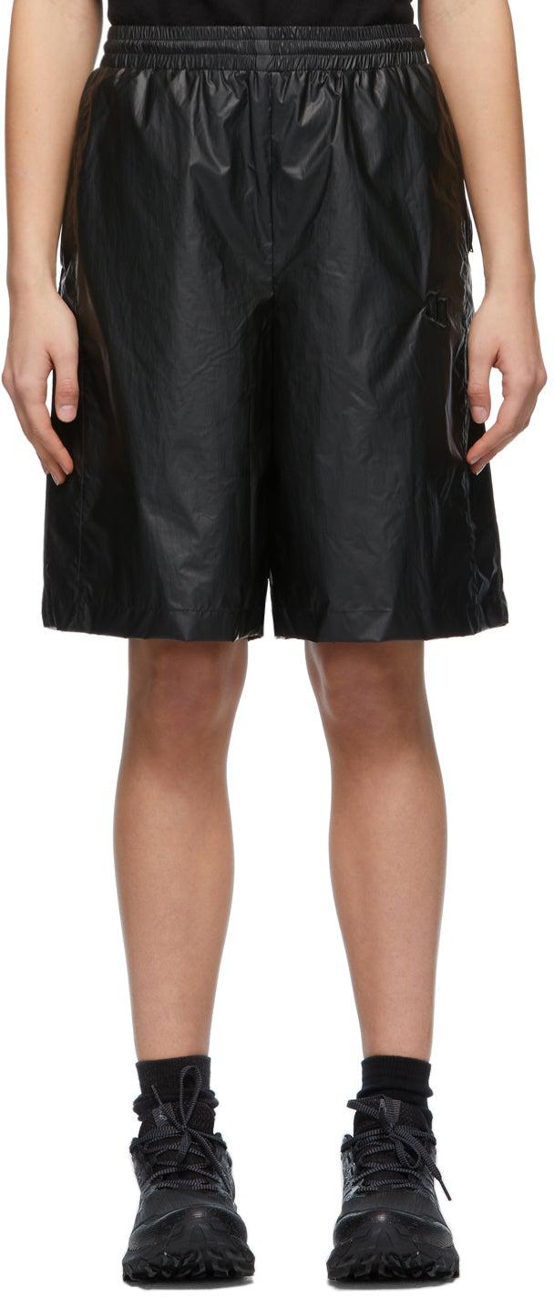 Nylon taffeta shorts in black. Mid-rise. Three-pocket styling. Concealed drawstring at elasticized waistband. Tonal logo embroidered at front. Full tonal mesh lining. Tonal hardware. Supplier color: Black Body: 100% nylon. Lining: 100% polyester. Brand: Juun.J