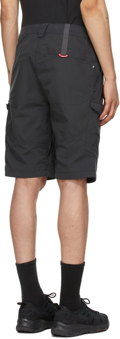 Paneled organic stretch cotton and nylon-blend canvas and ripstop shorts in soft black. Mid-rise. Three-pocket styling. Belt loops at waistband. Pleats, flap pockets, and tonal embroidered logo at front. D-ring hardware at back. Zip-fly. Gunmetal-tone, silver-tone, and pink hardware. Supplier color: Raven/Raven 67% organic cotton, 31% polyamide, 2% elastane. Brand: Klättermusen