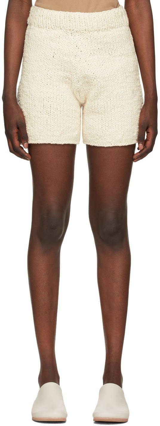 Handcrafted rib knit shorts in white. High-rise. Elasticized waistband. Supplier color: Roving 100% cotton. Brand: Lauren Manoogian
