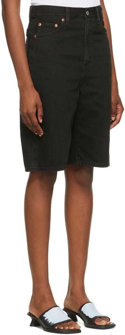 Non-stretch cotton-blend denim shorts in black. High-rise. Fading throughout. Five-pocket styling. Belt loops at waistband. Logo patch in tan at back waistband. Textile logo flag in red at back pocket. Zip-fly. Logo engraved silver-tone and copper-tone hardware. Supplier color: Take it slow 79% cotton, 21% lyocell. Brand: Levi's