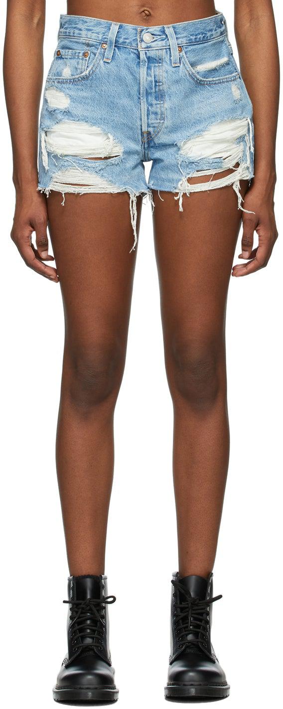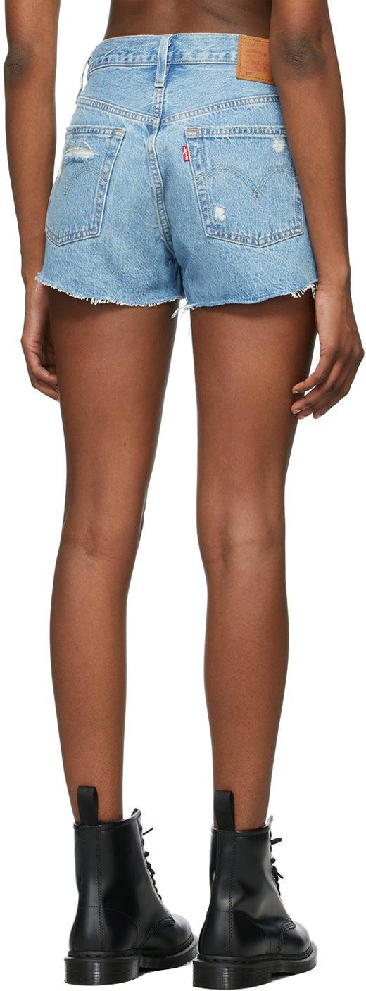 Non-stretch denim shorts in blue. Mid-rise. Fading, whiskering, and distressing throughout. Five-pocket styling. Belt loops at waistband. Tan leather logo patch at back waistband. Textile logo flag in red at back pocket. Raw edge at cuffs. Button-fly. Logo-engraved silver-tone and copper-tone hardware. Supplier color: Luxor anubis medium wash 100% cotton. Brand: Levi's