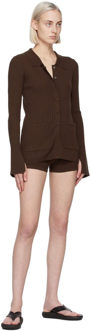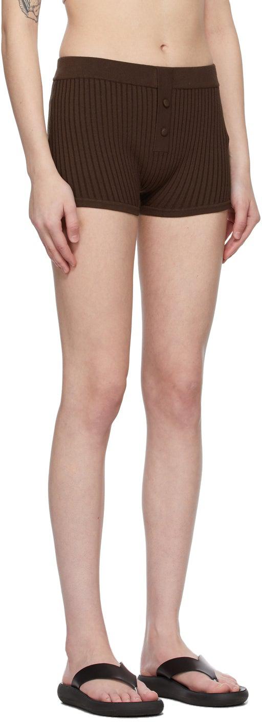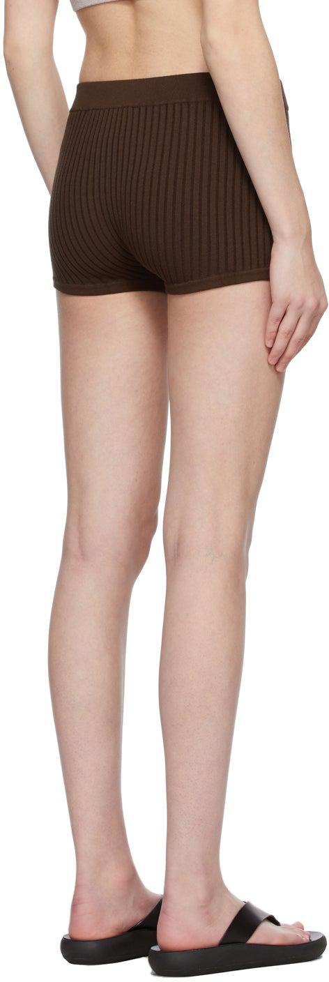 Stretch rib knit viscose-blend shorts in brown. High-rise. Elasticized waistband. Mock button-fly. Supplier color: Chocolate 71% viscose, 16% nylon, 11% polybutylene terephthalate, 2% spandex. Brand: Live the Process