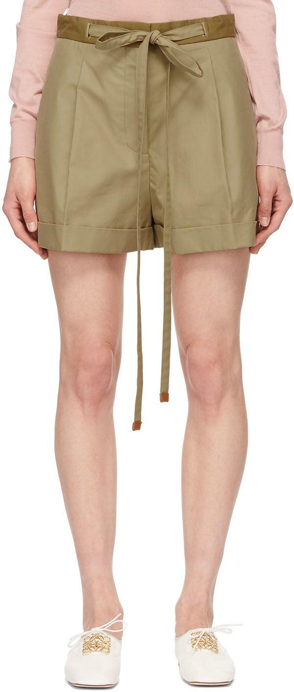 Cotton canvas shorts in beige. Mid-rise. Three-pocket styling. Self-tie belt and pleats at waistband. Rolled cuffs. Zip-fly. Silver-tone hardware. Supplier color: Sweet caramel 100% cotton. Brand: Loewe