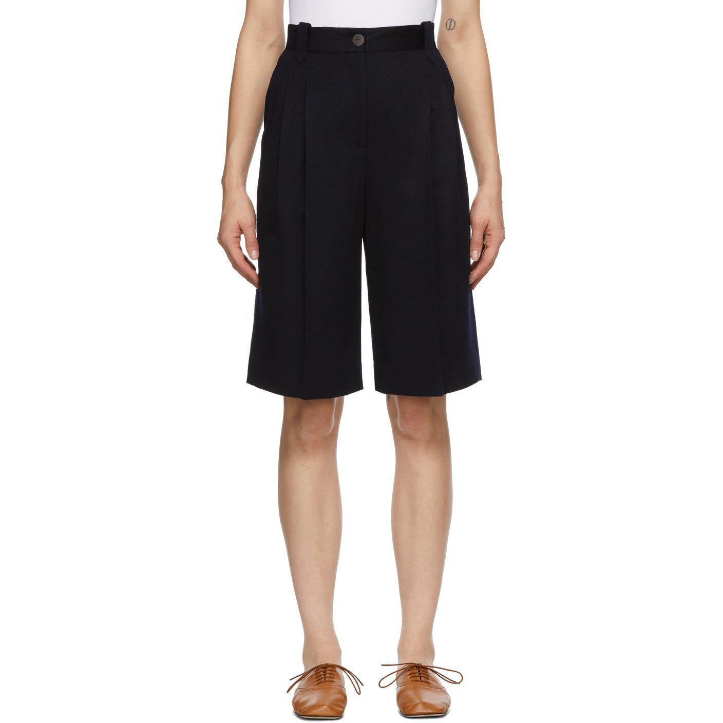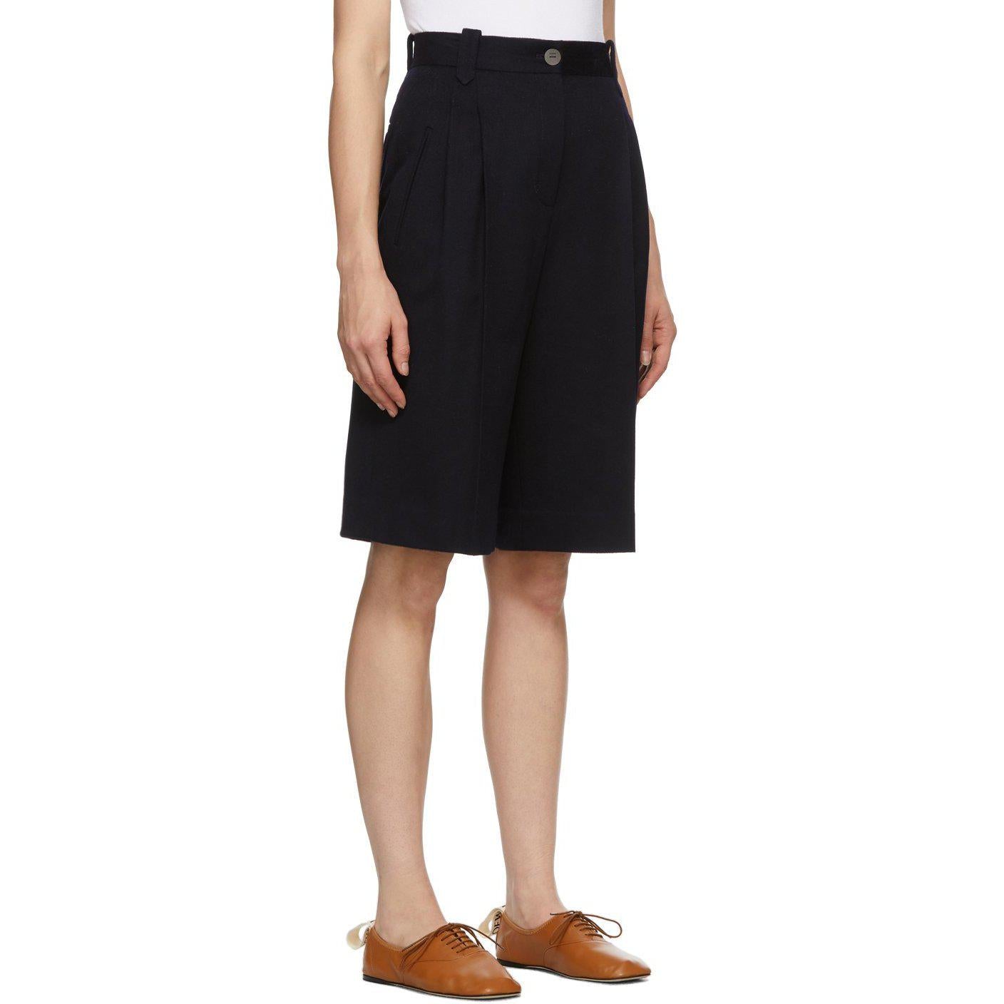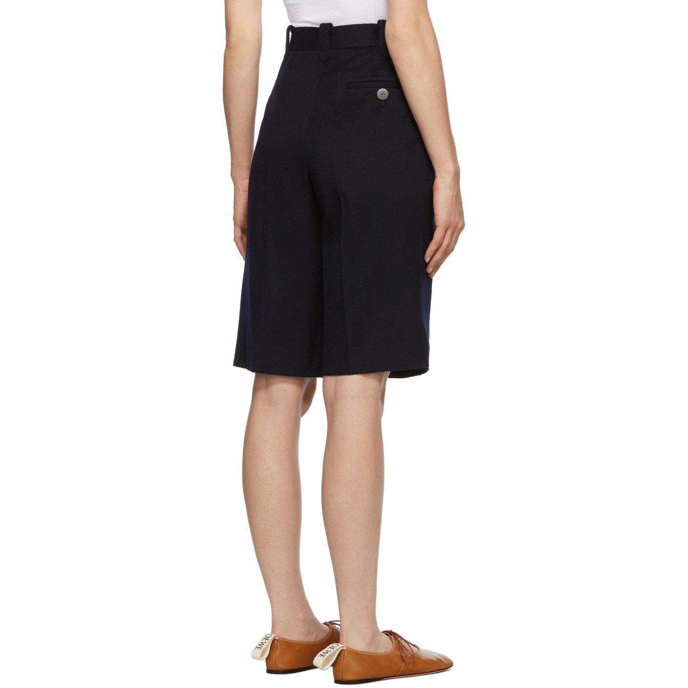 Brushed virgin wool shorts in navy. Mid-rise. Three-pocket styling. Belt loops at waistband. Pleats at front. Central creases at front and back. Zip-fly. Fully lined. Tonal and brown hardware. Supplier color: Navy Body: 100% wool. Trim: 100% cotton. Lining: 53% cupro, 47% polyurethane. Brand: Loewe