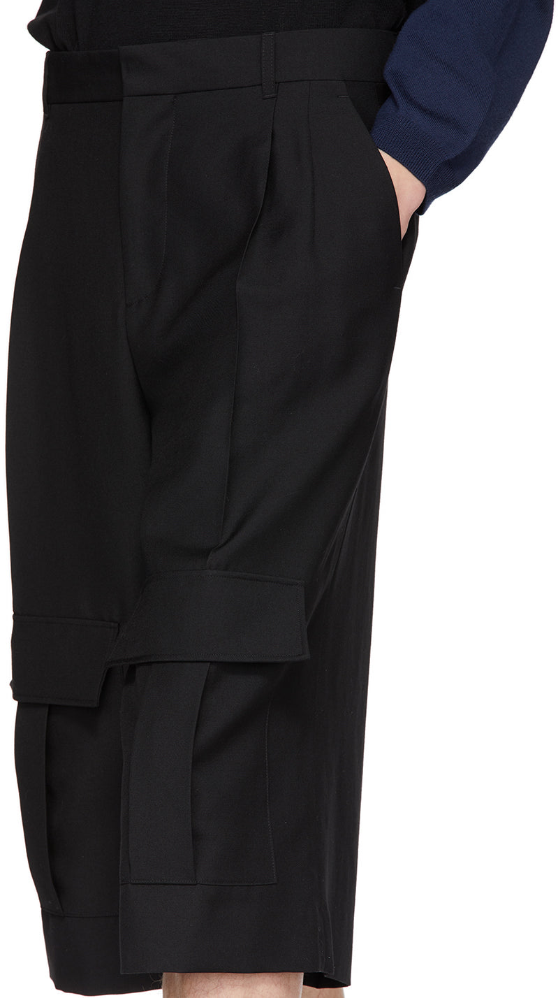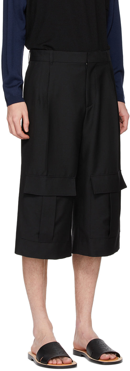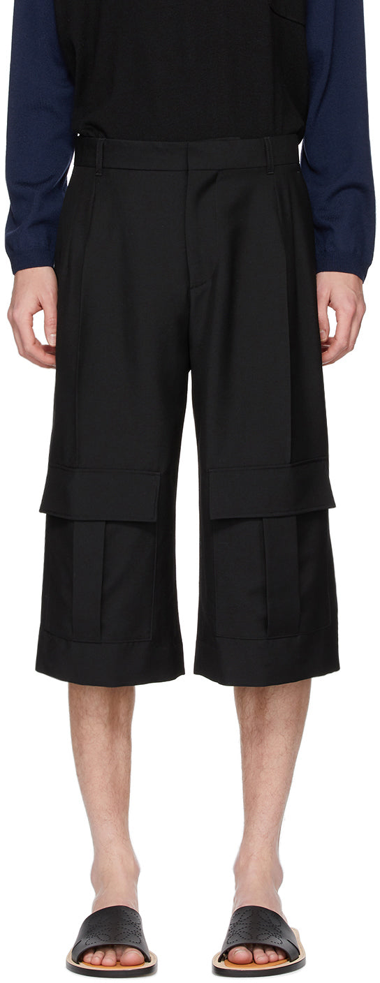 Wool twill shorts in navy. Mid-rise. Four-pocket styling. Belt loops at waistband. Pleats and flap pockets at front. Central creases at front and back. Zip-fly. Tonal hardware. Supplier color: Dark navy blue Body: 100% wool. Lining 1: 100% cupro. Lining 2: 100% cotton. Brand: Loewe