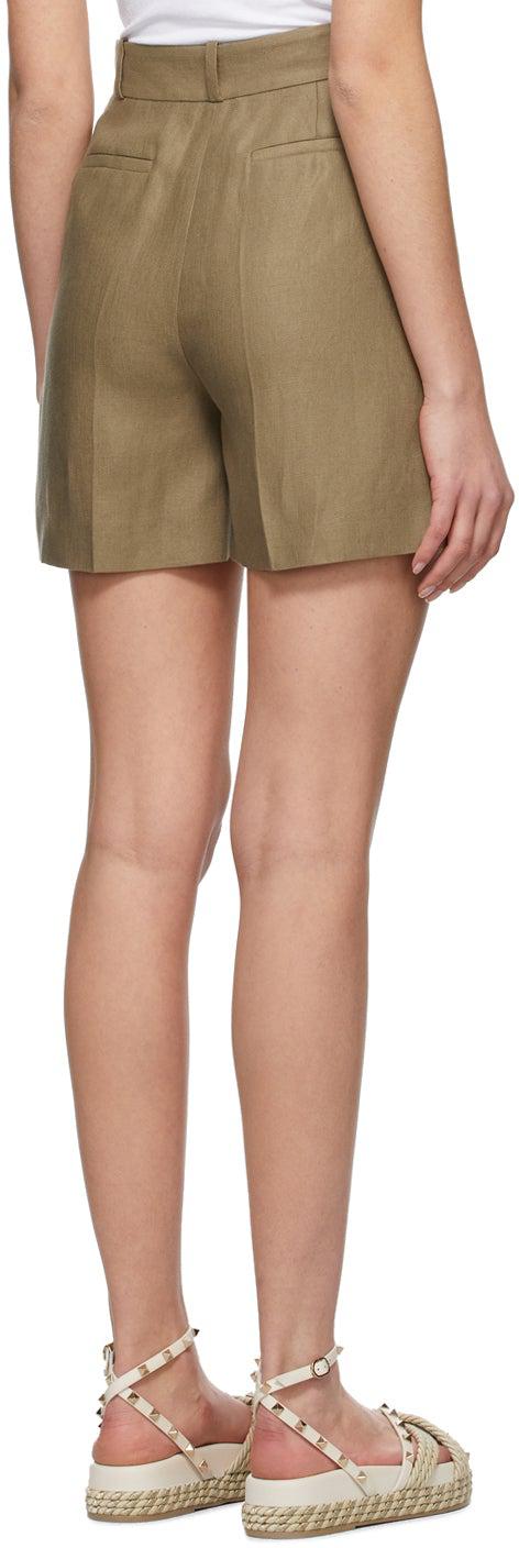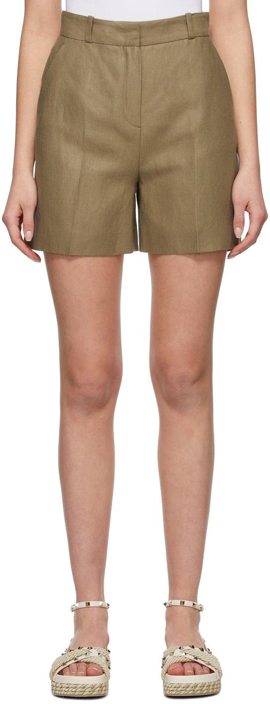 Plain-woven linen shorts in khaki. Mid-rise. Four-pocket styling. Belt loops at waistband. Central crease at front and back. Unlined. Zip-fly. Supplier color: Coriander powder 100% linen. Brand: Loro Piana