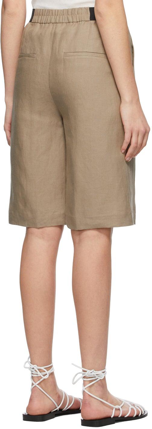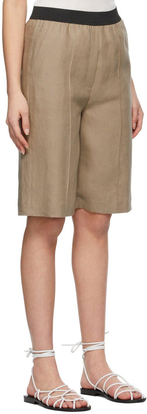 Woven linen shorts in taupe. Mid-rise. Four-pocket styling. Elasticized waistband in black and taupe. Central creases at front and back. Supplier color: Taupe 100% linen. Brand: Loulou Studio
