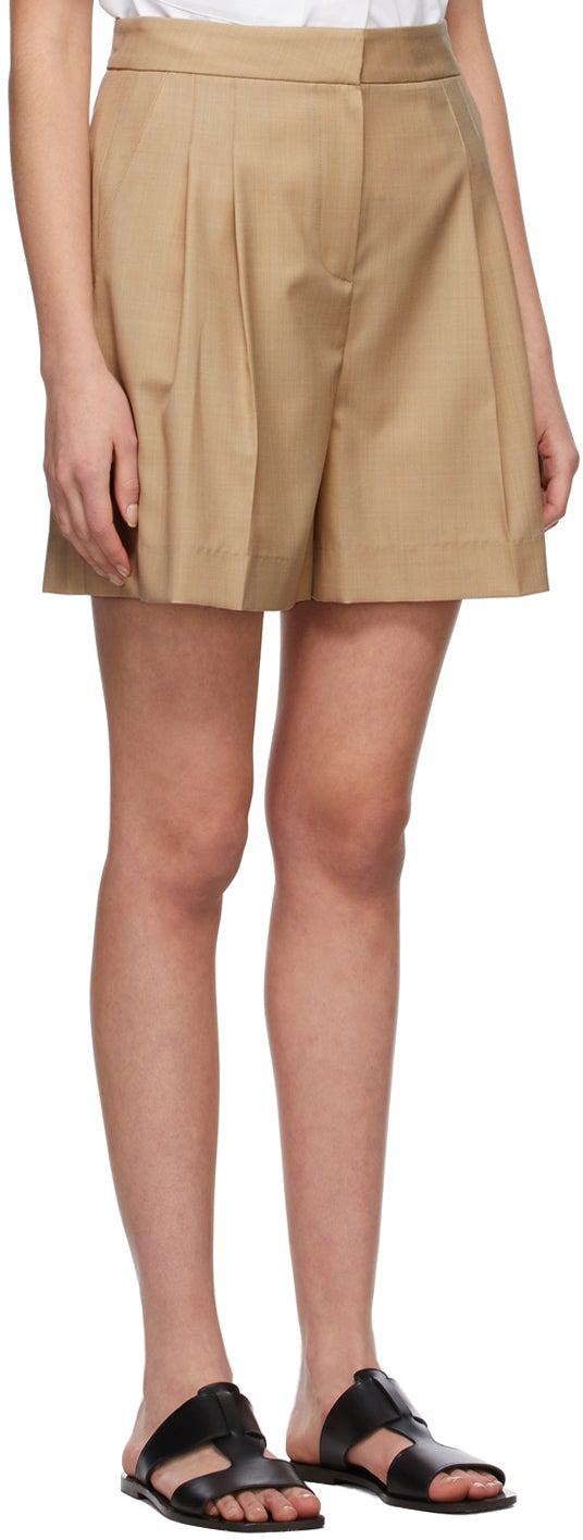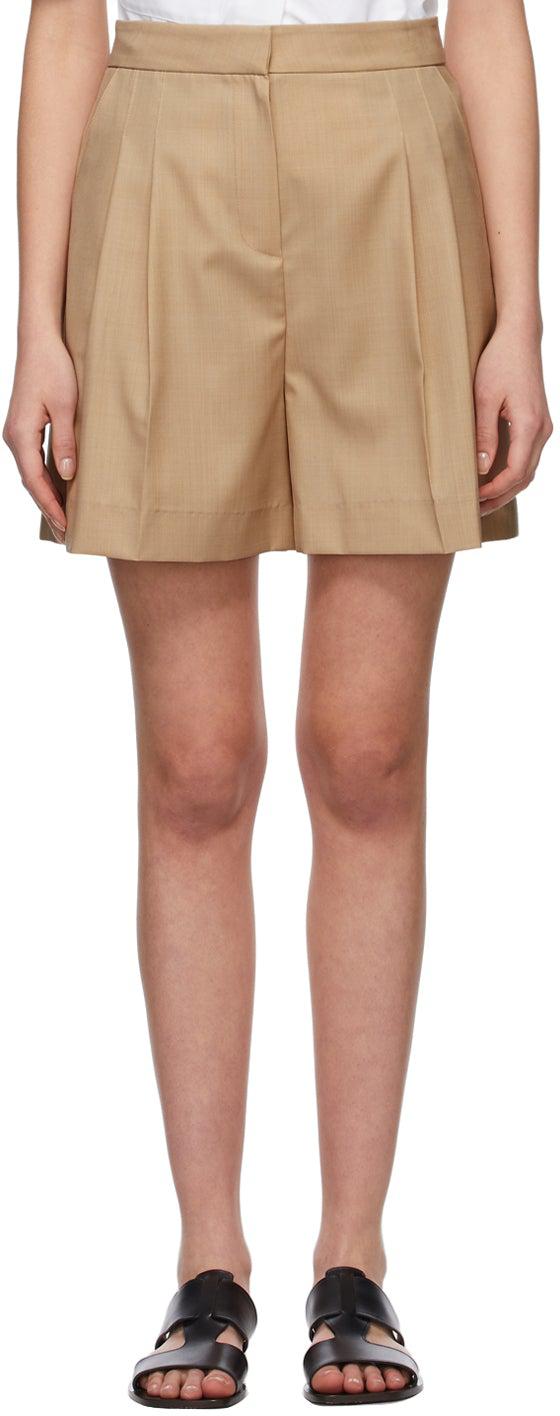 Wool-blend twill shorts in beige. High-rise. Four-pocket styling. Pleats at front. Central creases at front and back. Zip-fly. Supplier color: Beige 70% polyester, 30% wool. Brand: LVIR