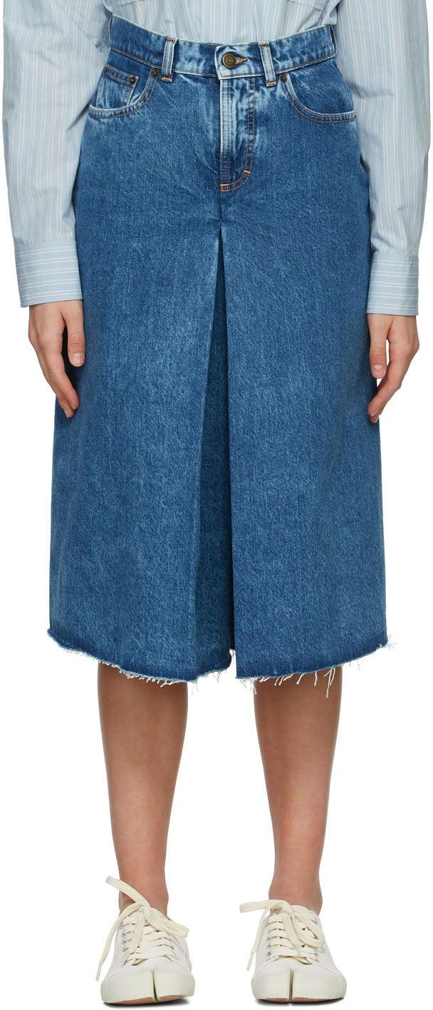Non-stretch recycled cotton denim shorts in blue. Mid-rise. Fading throughout. Five pocket styling. Belt loops at waistband. Inverted box pleat at front and back. Signature white stitching at back waistband. Unfinished cuffs. Zip-fly. Antiqued gold-tone hardware. Contrast stitching in tan. Supplier color: Blue denim Body: 100% recycled cotton. Trim: 65% polyester, 35% cotton. Brand: Maison Margiela