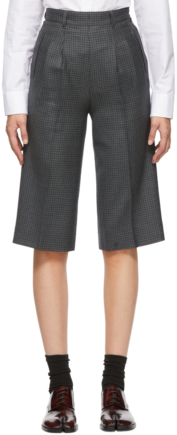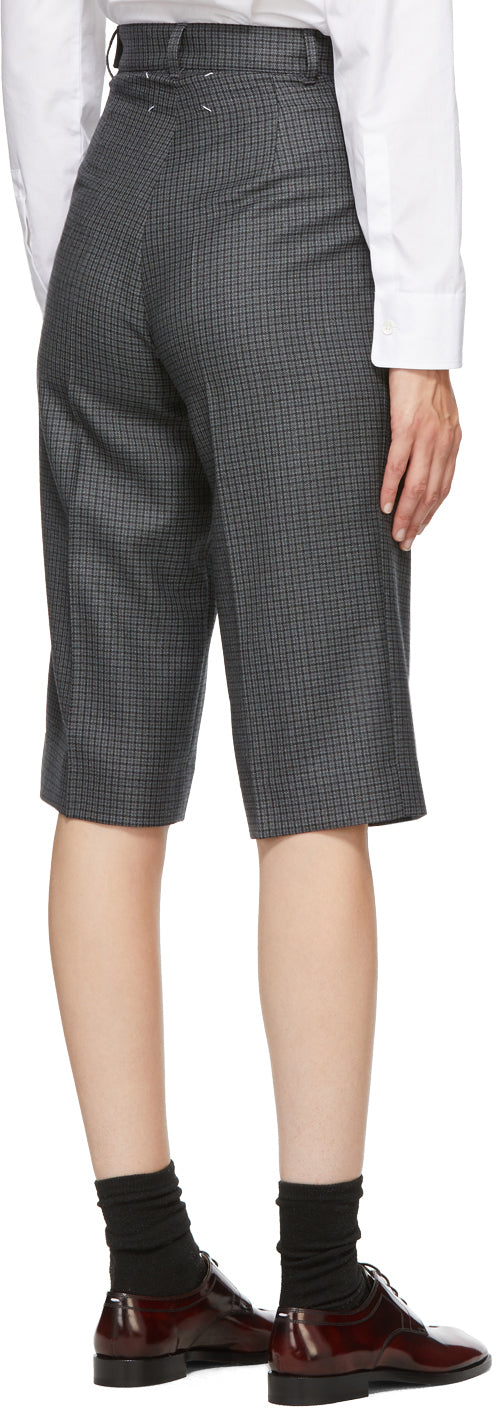 Wool-blend plain-woven shorts featuring houndstooth pattern in blue, grey, and black throughout. High-rise. Two-pocket styling. Belt loops at waistband. Creases and pleats at front. Concealed zip closure at outseam. Darts at back waistband. Central creases at back. Signature stitching in white at back. Silver-tone hardware. Supplier color: Blue 100% wool. Brand: Maison Margiela