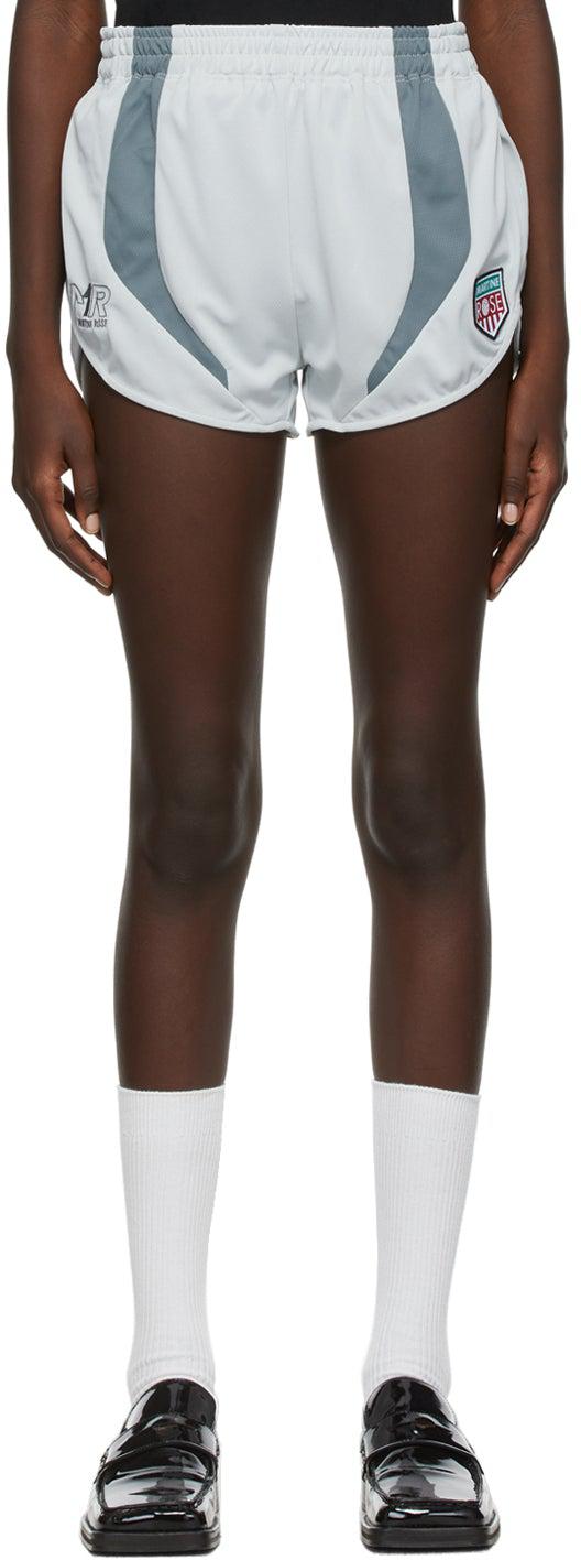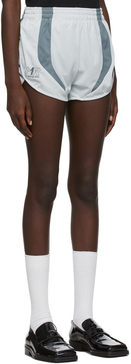Technical jersey shorts in grey. Mid-rise. Elasticized waistband. Two-pocket styling. Graphic logo embroidered in multicolor at cuffs. Supplier color: Light grey 100% polyester. Brand: Martine Rose