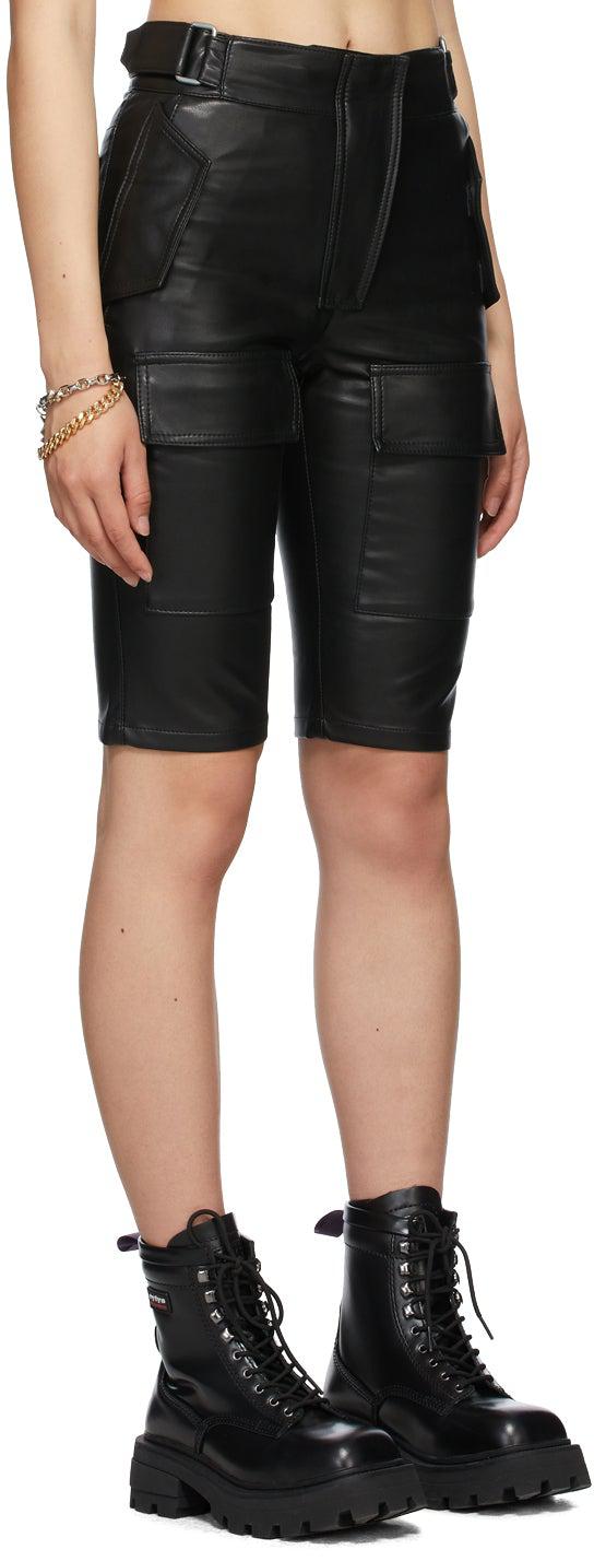 Buffed faux-leather shorts in black. High-rise. Four-pocket styling. Adjustable Velcro straps at waistband. Flap pocket at front legs. Zip-fly. Silver-tone hardware. Supplier color: Black 55% polyurethane, 45% viscose. Brand: MISBHV