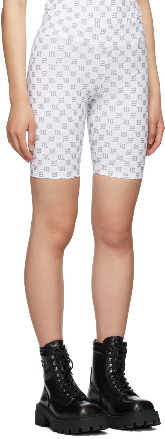 Stretch nylon jersey shorts in white featuring logo pattern printed in reflective silver-tone. High-rise. Elasticized waistband. Supplier color: White 78% polyamide, 22% elastane. Brand: MISBHV