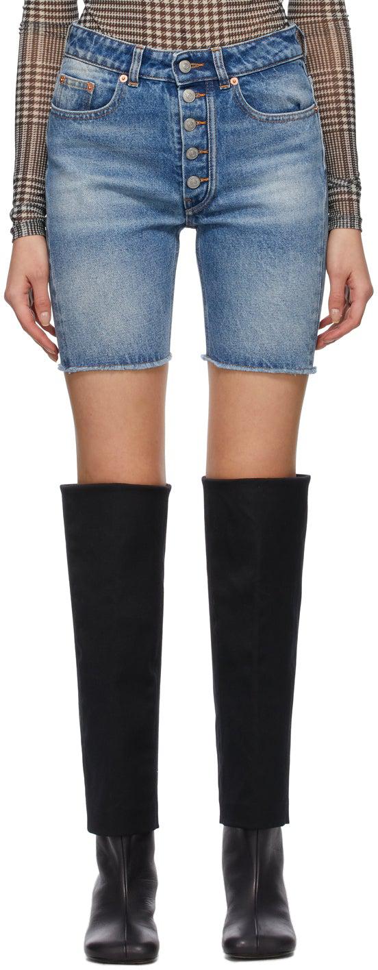 Non-stretch denim shorts in blue. Mid-rise. Fading and whiskering throughout. Five-pocket styling. Belt loops at waistband. Signature white stitching at back waistband. Raw edge at cuffs. Button-fly. Silver-tone and copper-tone hardware. Contrast stitching in tan. Supplier color: Vintage wash 100% cotton. Brand: MM6 Maison Margiela