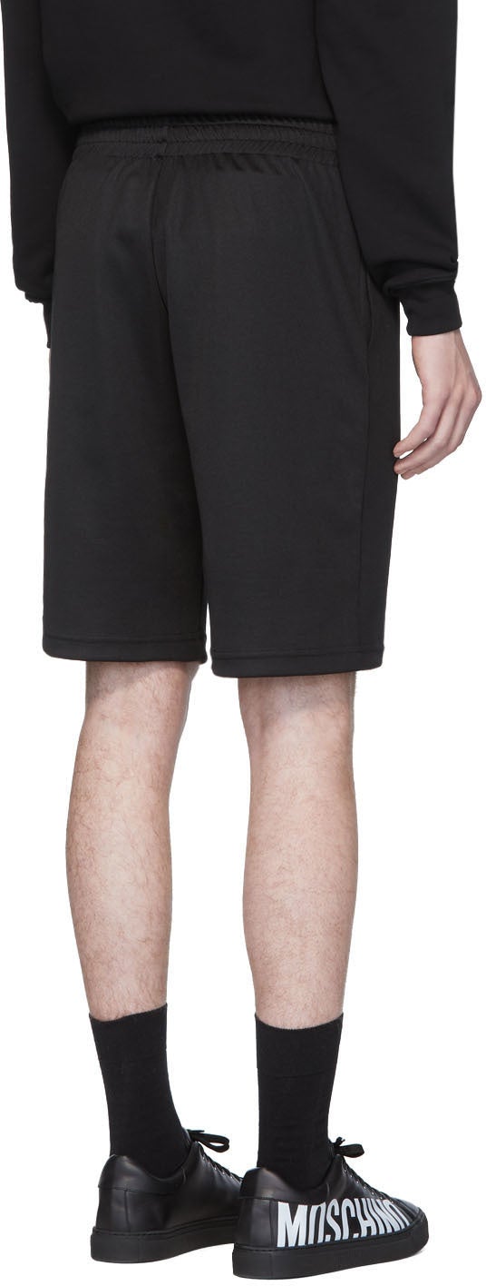 Cotton-blend jersey shorts in black. Mid-rise. Two-pocket styling. Concealed drawstring at waistband. Logo printed in black and white at leg. Supplier color: Black 55% polyester, 45% cotton. Brand: Moschino