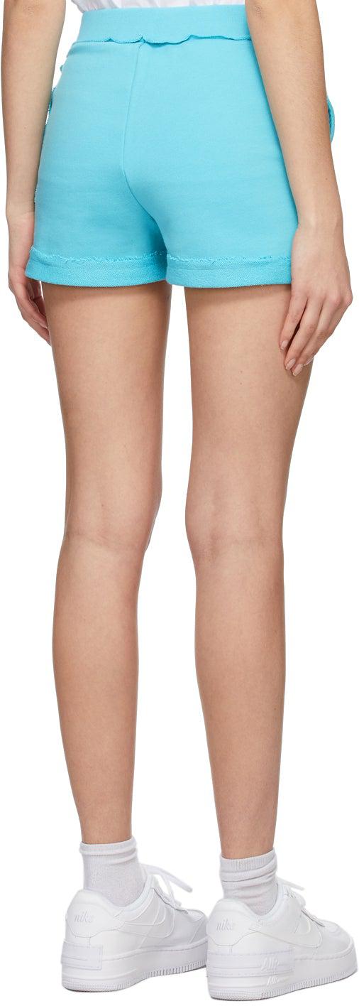 French terry shorts in blue. High-rise. Extended seams featuring raw edges throughout. Two-pocket styling. Elasticized waistband. Embroidered logo in black, brown, and white at leg. Rolled cuffs. Supplier color: Blue 100% cotton. Brand: Moschino