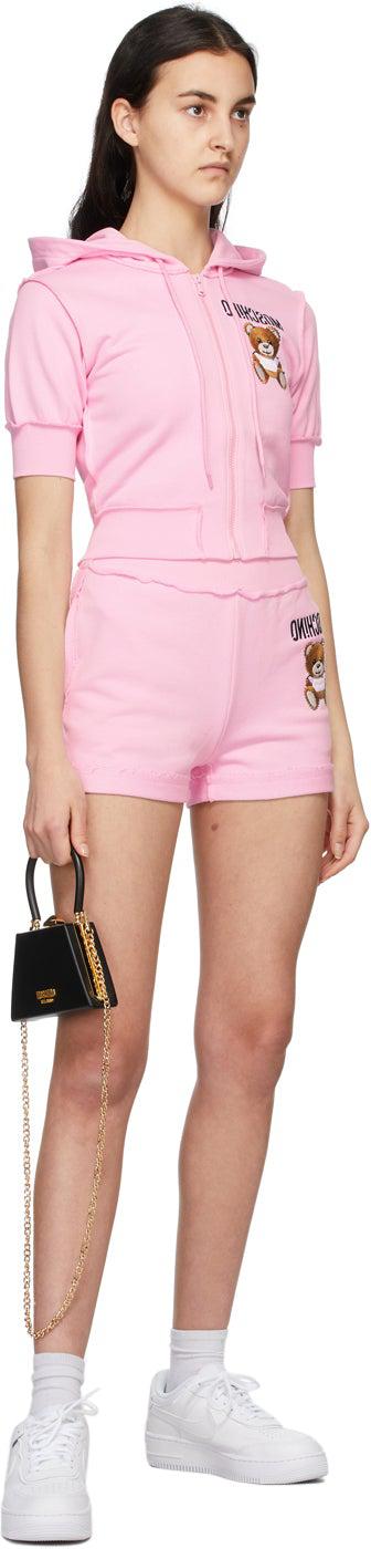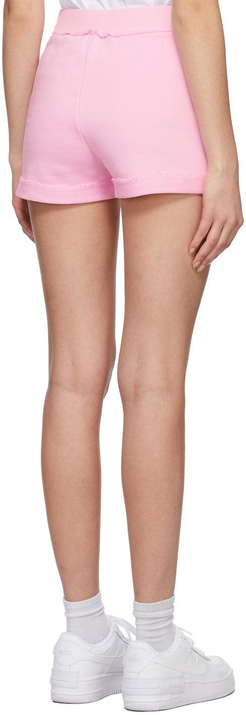 French terry shorts in pink. High-rise. Extended seams featuring raw edges throughout. Two-pocket styling. Elasticized waistband. Embroidered logo in black, brown, and white at leg. Rolled cuffs. Supplier color: Pink 100% cotton. Brand: Moschino