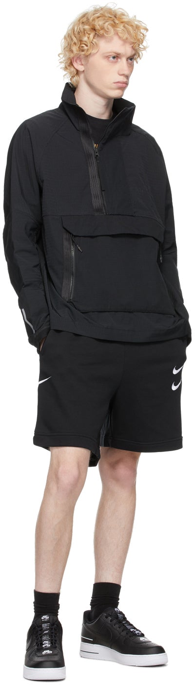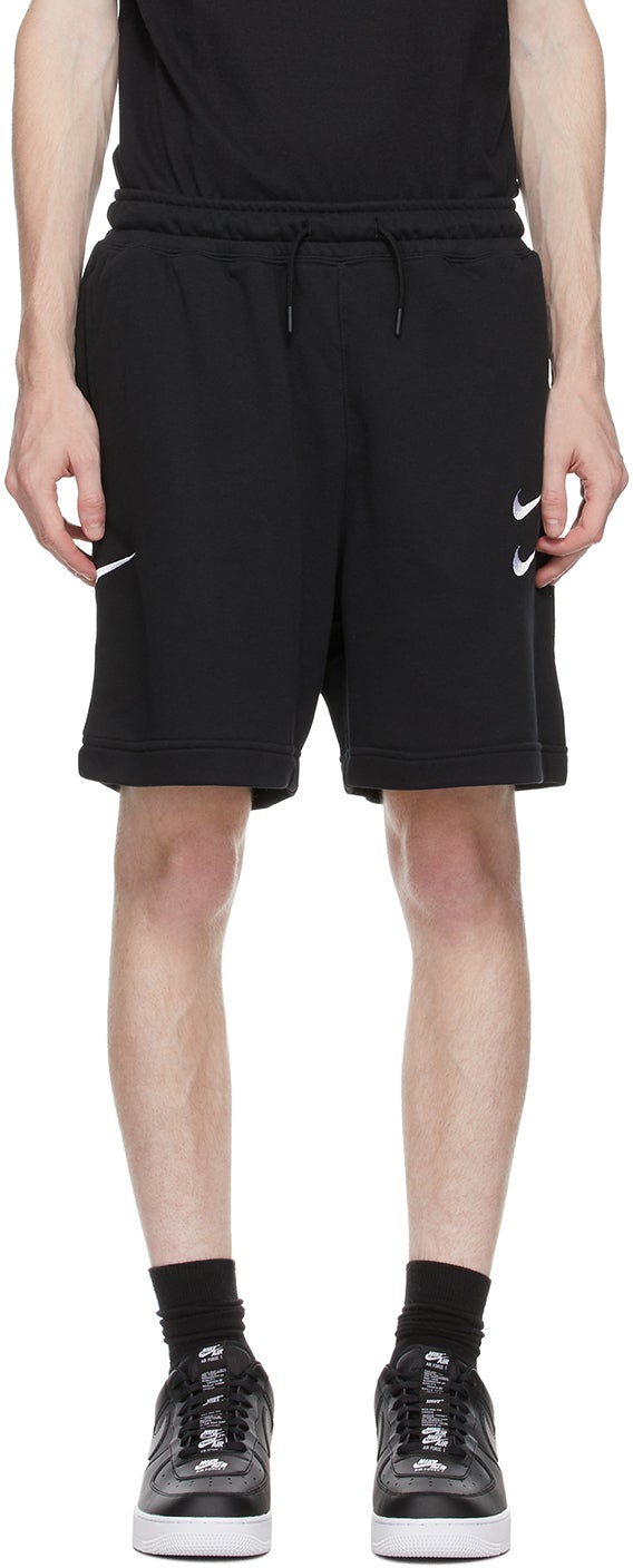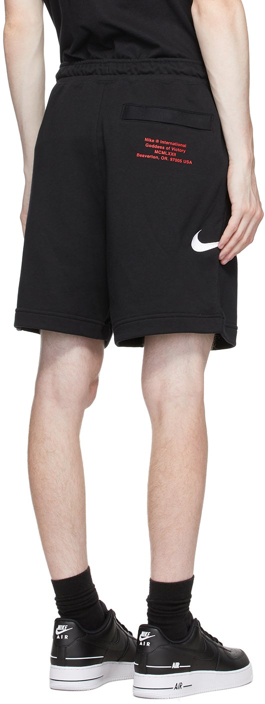 Cotton-blend French terry shorts in black. Mid-rise. Two-pocket styling. Tonal drawstring at elasticized waistband. Swoosh embroidered in white at front and side seam. Welt pocket with press-stud closure at back featuring text printed in red. Supplier color: Black/White Body: 80% cotton, 20% polyester. Trim: 100% cotton. Brand: Nike