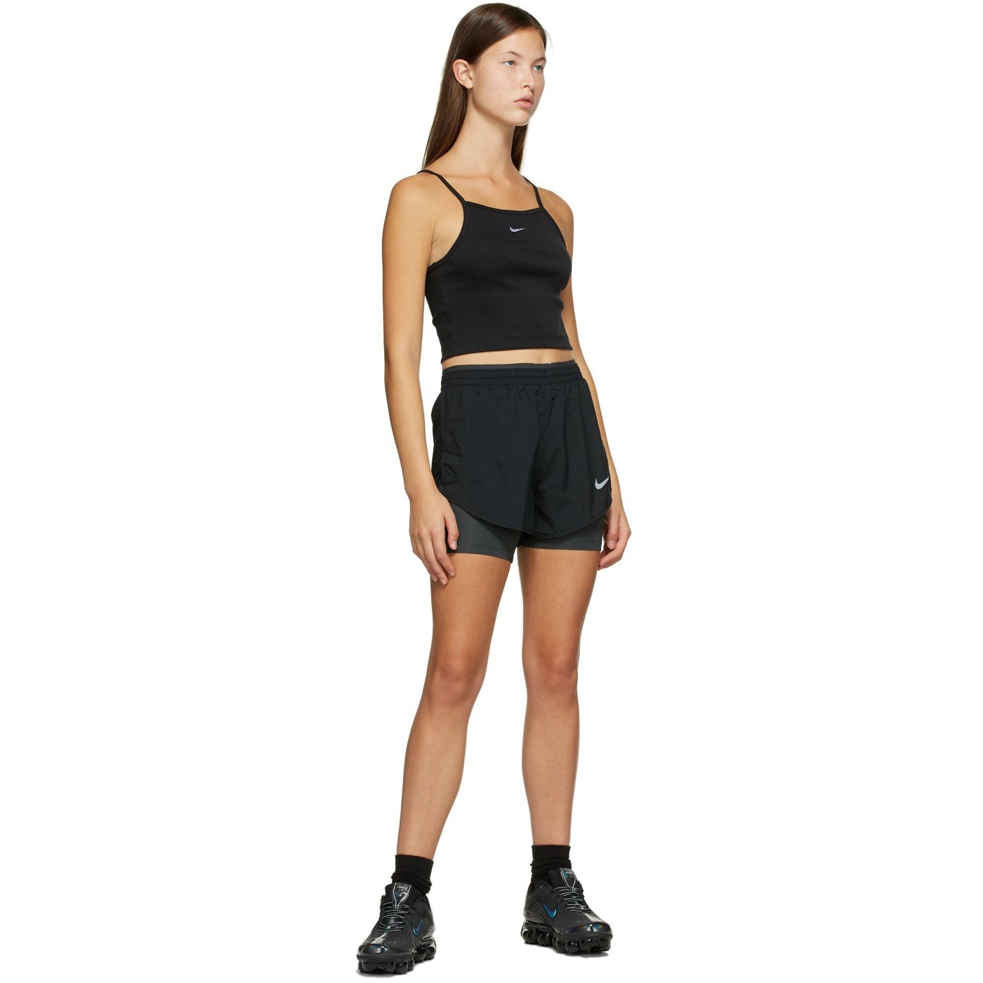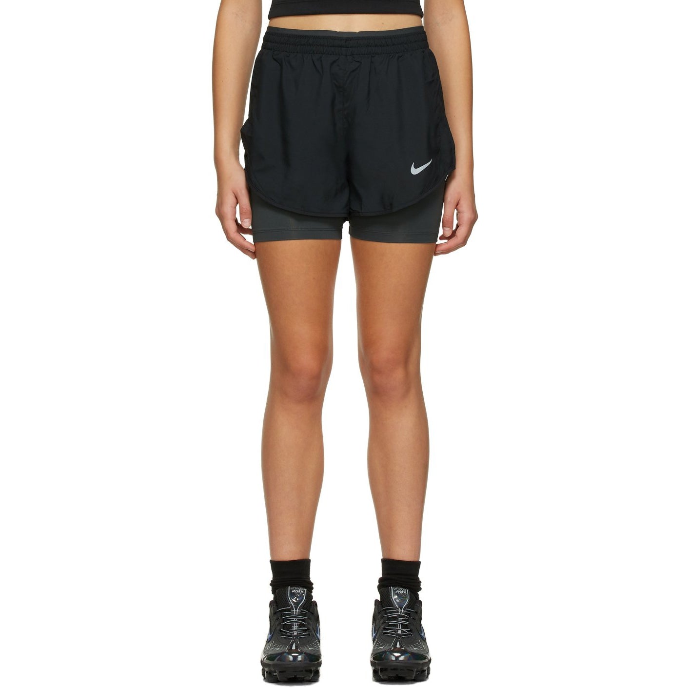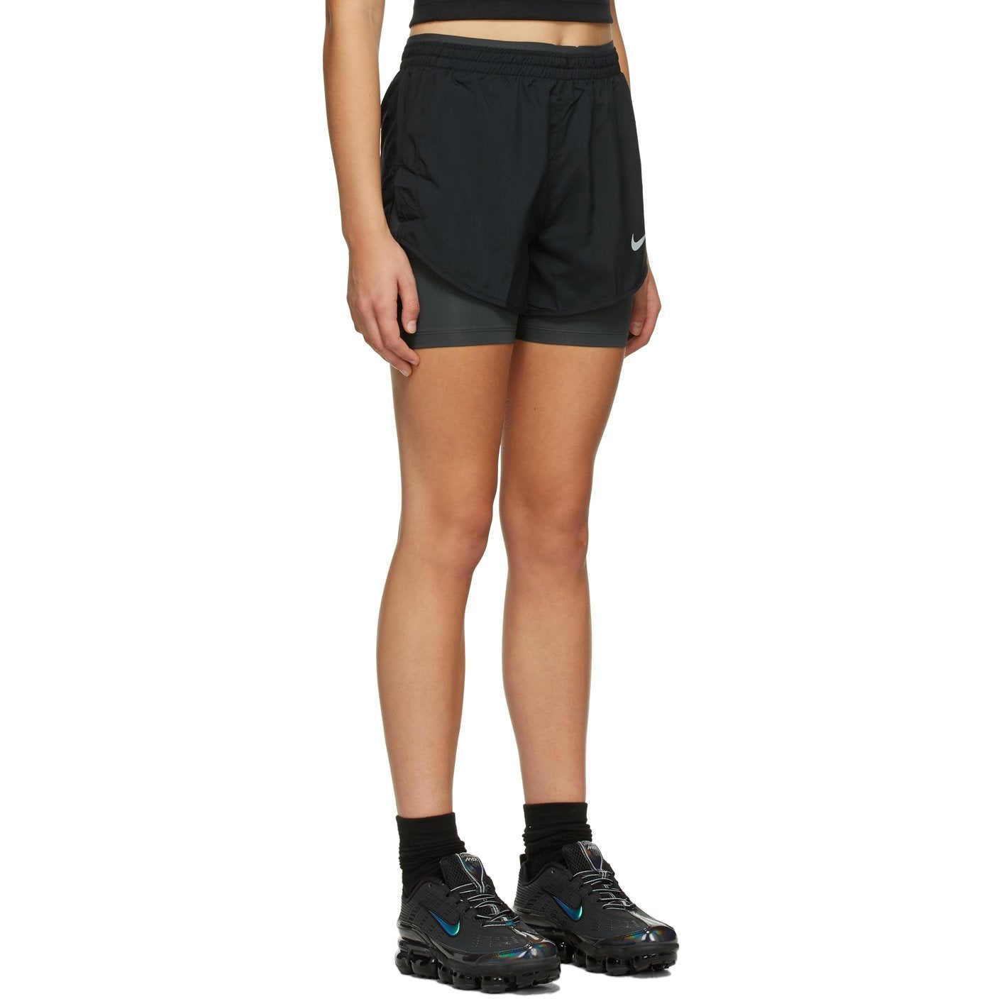 Technical taffeta shorts in black featuring integrated stretch jersey bike short-style underlay in grey. Mid-rise. Concealed drawstring at elasticized waistband. Swoosh printed in white at front. Vented outseams. Supplier color: Black Body 1: 100% polyester. Body 2: 84% recycled polyester, 16% spandex. Lining: 100% polyester. Brand: Nike