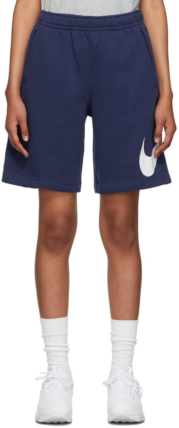 Fleece shorts in navy. High-rise. Three-pocket styling. Concealed drawstring at elasticized waistband. Bonded Swoosh in white at outseam. Supplier color: Navy Body: 80% cotton, 20% polyester. Trim: 100% cotton. Brand: Nike