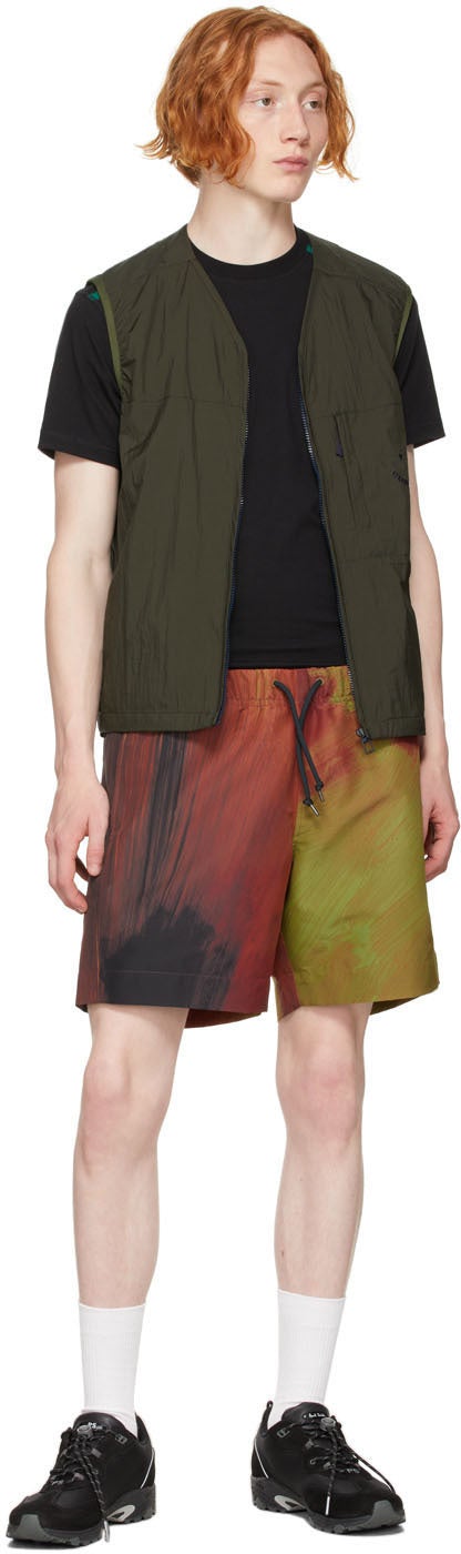 Ripstop shorts featuring graphic printed in tones of green, red, and black. Mid-rise. Three-pocket styling. Drawstring at elasticized waistband. Full mesh lining. Purple hardware. Supplier color: Coral 65% polyester, 35% recycled polyester. Brand: PS by Paul Smith
