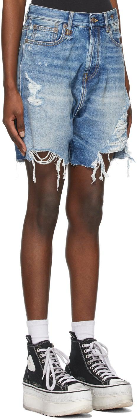Non-stretch denim shorts in blue. High-rise. Dropped inseam. Fading, whiskering, and distressing throughout. Five-pocket styling. Belt loops at waistband. Leather logo patch in black at back waistband. Topstitching in indigo at back pocket. Raw edge at cuffs. Button-fly. Logo-engraved antiqued silver-tone hardware. Contrast stitching in tan. Supplier color: Bain 100% cotton. Brand: 13